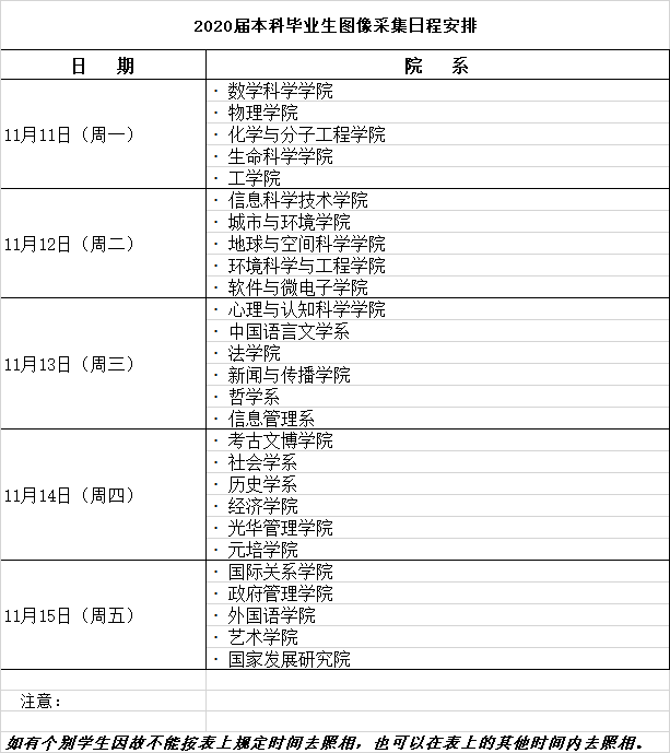 2020届本科毕业生图像采集工作现已启动。凡预计于2020年7月毕业的本科生(包括我校普通本科生和留学生、国家发展研究院的校外双学位学生),请根据时间表的安排,前往指定地点拍照。