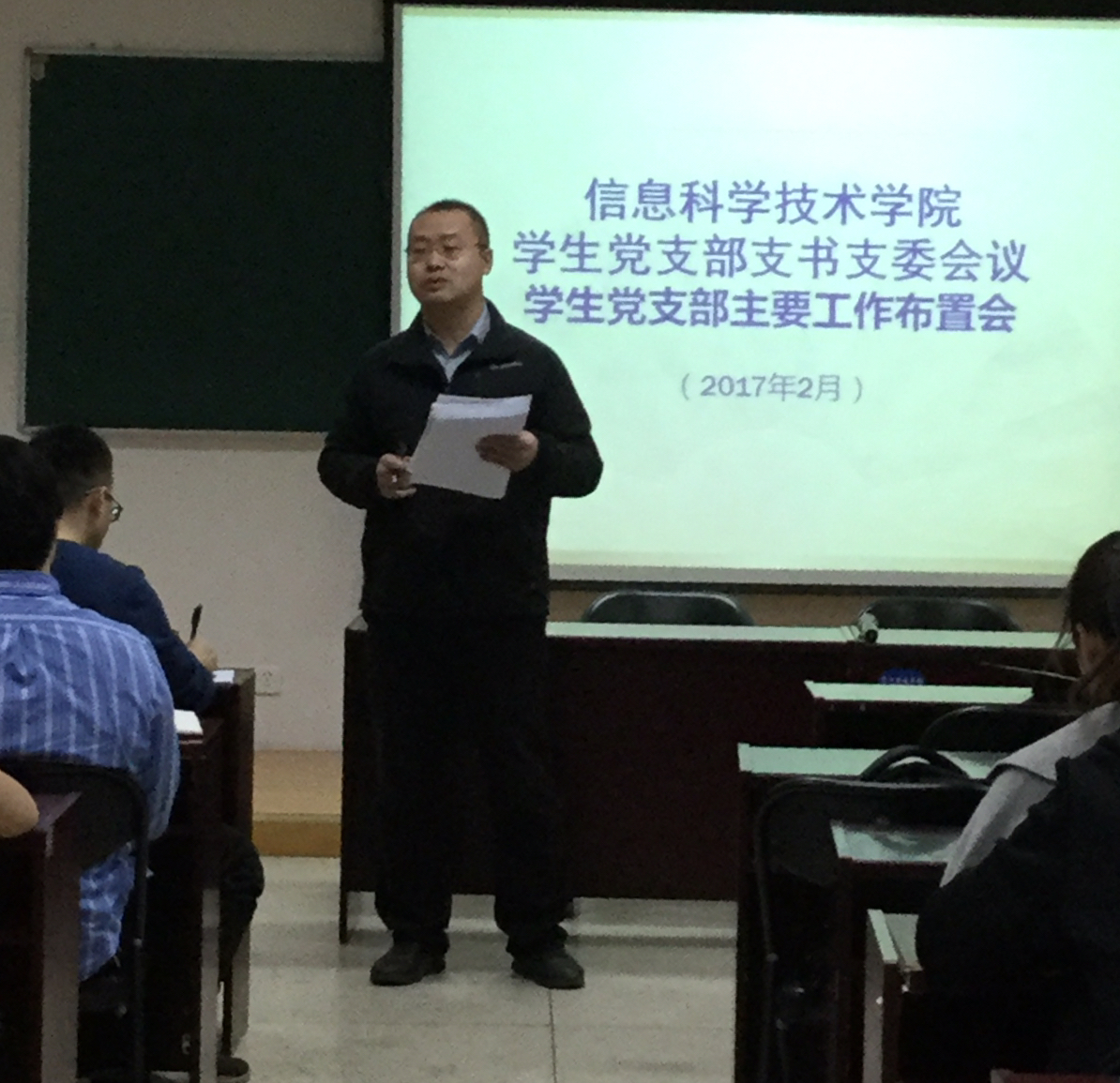 2月28日上午,信息科学技术学院2017年春季学期学生党员骨干研修班暨学生支部支书支委会议在理科一号楼1126召开。学院党委书记魏中鹏老师、党委副书记熊校良老师、学院党委人事办公室副主任杨琦老师、学院学工办副主任秦艳龙老师、学生党支部书记支委共计50余人参加了会议。会议由学院学工办副主任秦艳龙老师主持。
