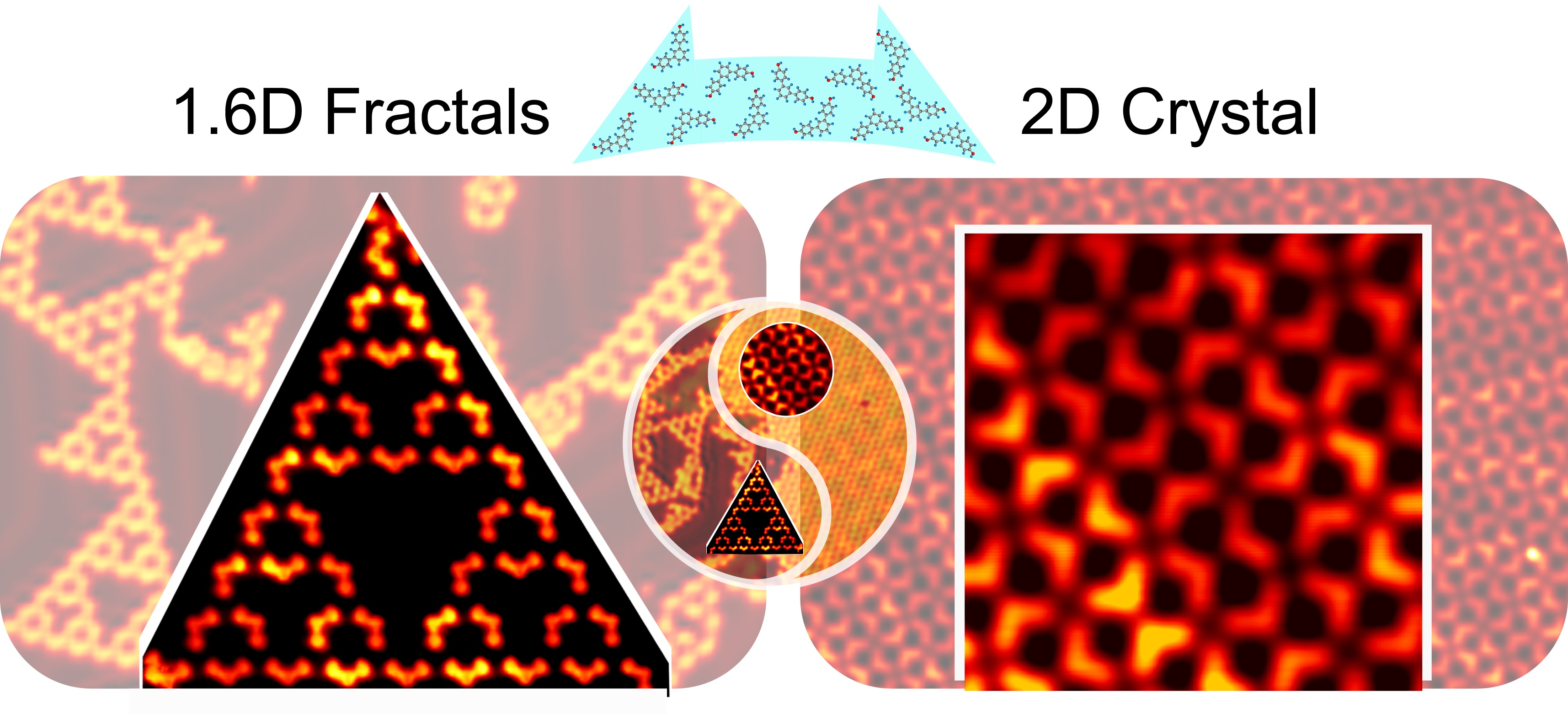 王永锋课题组及其合作者目前正致力于研究分形晶、准晶与传统晶体三相的共生长。通过在惰性金属表面共沉积折线形C3P7有机分子和Fe原子,利用二者之间所形成的稳定配位键,制备出完美的表面配位谢尔宾斯基(Sierpiński)三角分形结构。由于引入了金属磁性原子,分形结构可能具有潜在的催化作用与磁学性质。H3PH分子通过氢键可以形成三聚体与四聚体,两者能量相近,前者倾向于形成分形晶,后者倾向于形成二维晶体,故可以在表面观测到分形晶与晶体的共存,从而通过改变基底、覆盖度与分子结构,得以实现二者的竞争调控。