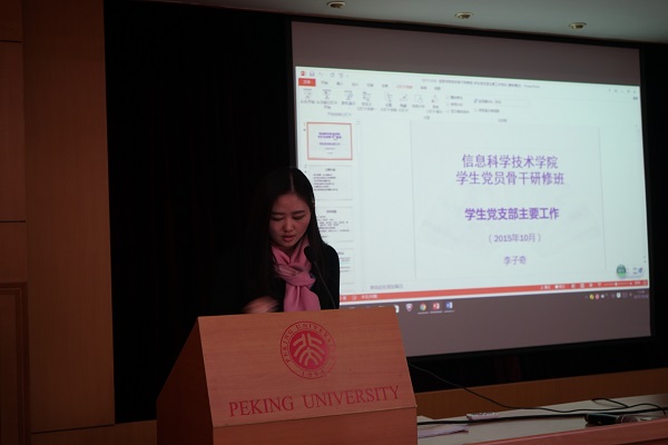 之后,李子奇老师就学生党支部的相关工作对大家进行了培训。她从学院党委情况介绍、学院学生党支部设置、组织生活、换届选举、党支部规范化建设、活动立项、党员发展、党校培训、本学期主要工作等多个方面进行讲解,详细的介绍使得同学们对学生党支部的工作有了清晰的了解,也为今后的工作奠定了基础。