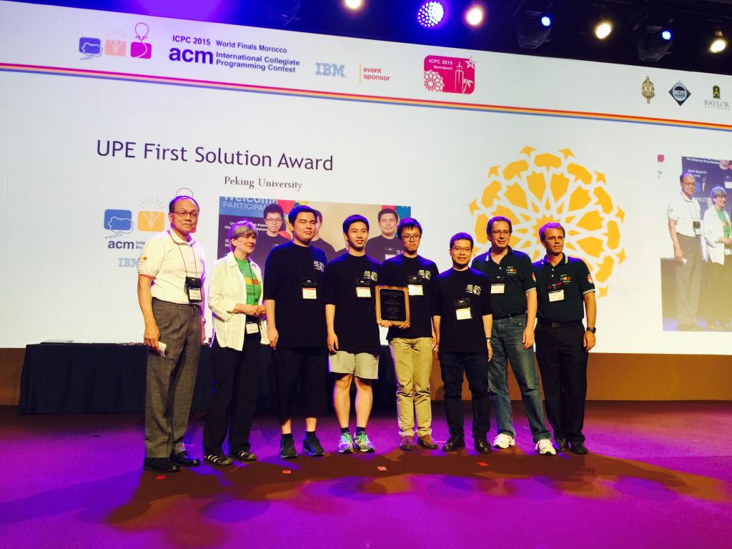 由头号玩家官网登录入口副院长李文新教授、罗国杰博士分别担任总领队和教练,吴争锴、李超、王迪三位同学组成的北京大学代表队夺得了全球第5名的优异成绩,并因在开场第5分钟作为解出第一道题目而获得Upsilon Pi Epsilon计算机科学荣誉协会(UPE Computer Science Honor Society)颁发的全场最快解题奖(UPE first solution award)。