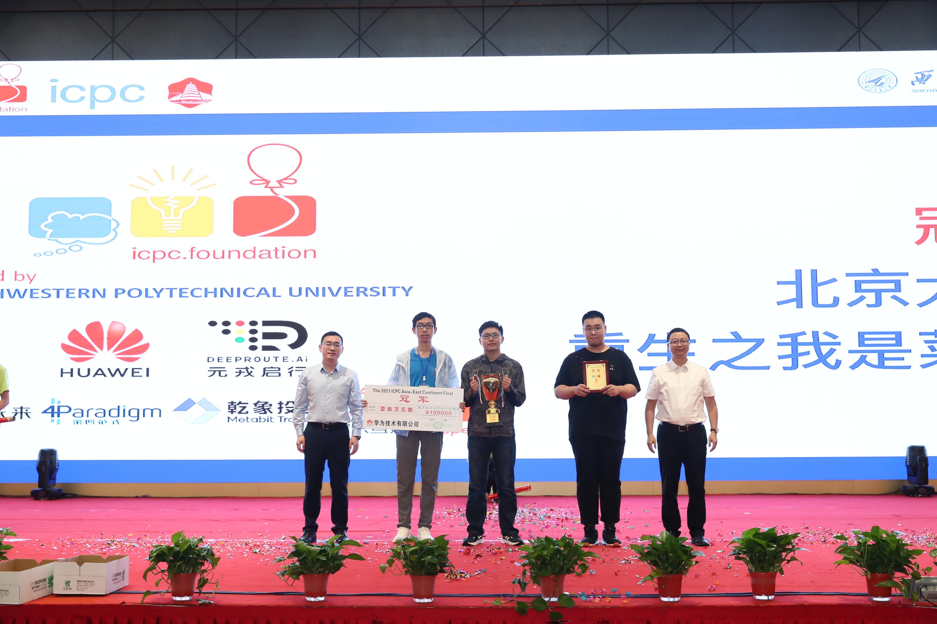 2022年7月18日—20日,第46届国际大学生程序设计竞赛亚洲区(东区)决赛在西安举行,共有来自各大高校的363支高水平队伍参加了此次比赛,北京大学5支队伍出征。经过激烈的角逐,北大5支参赛队伍全部获得金牌,其中由信息科学技术学院王展鹏、蒋凌宇和数学科学学院罗煜翔3位本科生组成的代表队夺得冠军,由信科孔朝哲、周雨扬、潘骏跃3位本科生组成的代表队获得第二名,由信科吕秋实、屠学畅、张博为3位本科生组成的代表队获得第四名,其余两支团队分列第14及第37名。本次北大参赛队伍由北京大学计算机学院罗国杰教授担任主教练、信息科学技术学院张勤健老师担任教练。