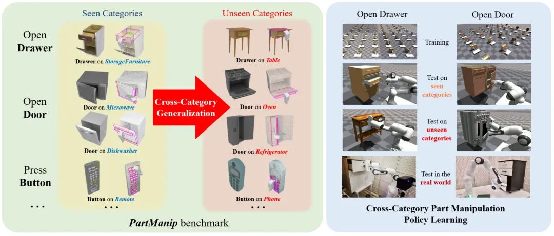 PartManip通过通用零件理解, 强化学习(RL), 模仿学习(Imitation Learning)学习铰接物体交互策略。