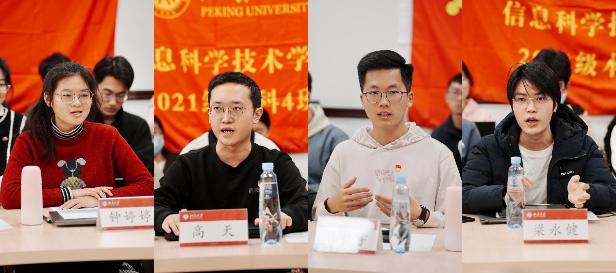 2021级4班班主任黄芊芊对班级情况进行了介绍。2021级4班为电子信息类本科生班级,班级积极响应新工科建设和国家“卡脖子”技术战略需求,专注培养具备家国情怀、学术才能、创新意识的高层次人才。在学院的建设支持和老师、同学们的共同努力下,班级在学术科研、党团建设、综合素质等方面取得了一系列成绩,先后荣获北京市先进班集体,北京大学示范班集体、先进班集体和信息科学技术学院思政实践课程优秀示范团队等奖励荣誉。