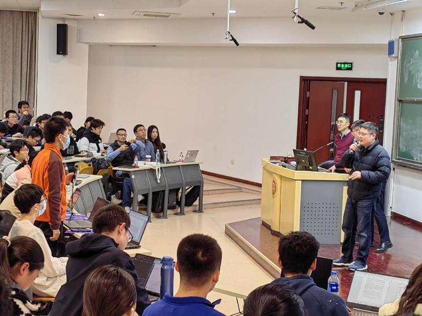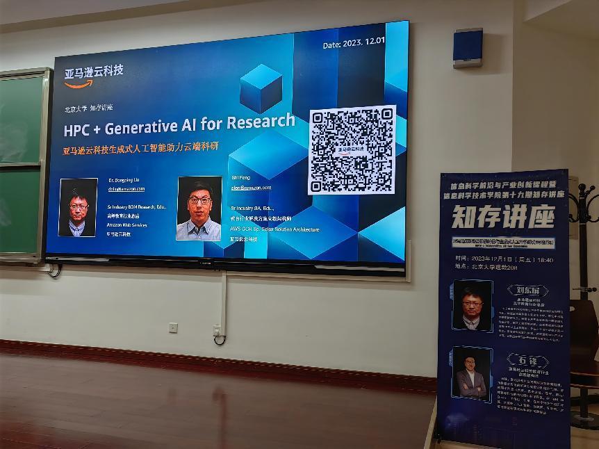 2023年12月1日晚,信息科学技术学院第十九期“知存头号玩家娱乐app官网”暨信息科学前沿与产业创新课程在北京大学理科教学楼208教室顺利举办。曾任中科院物理研究所副研究员,现任亚马逊云科技高等教育行业总监的刘东屏教授和亚马逊云科技资深解决方案架构师石锋老师受邀进行了以“亚马逊云科技生成式人工智能(GenAI)助力云端科研”为主题的分享,400余名师生到场聆听;信息科学技术学院副院长王润声教授主持了本次活动;亚马逊云科技的朱耀飞、乔敬霄、李亦钊等现场支持本次活动,并参与了学生问题的解答。