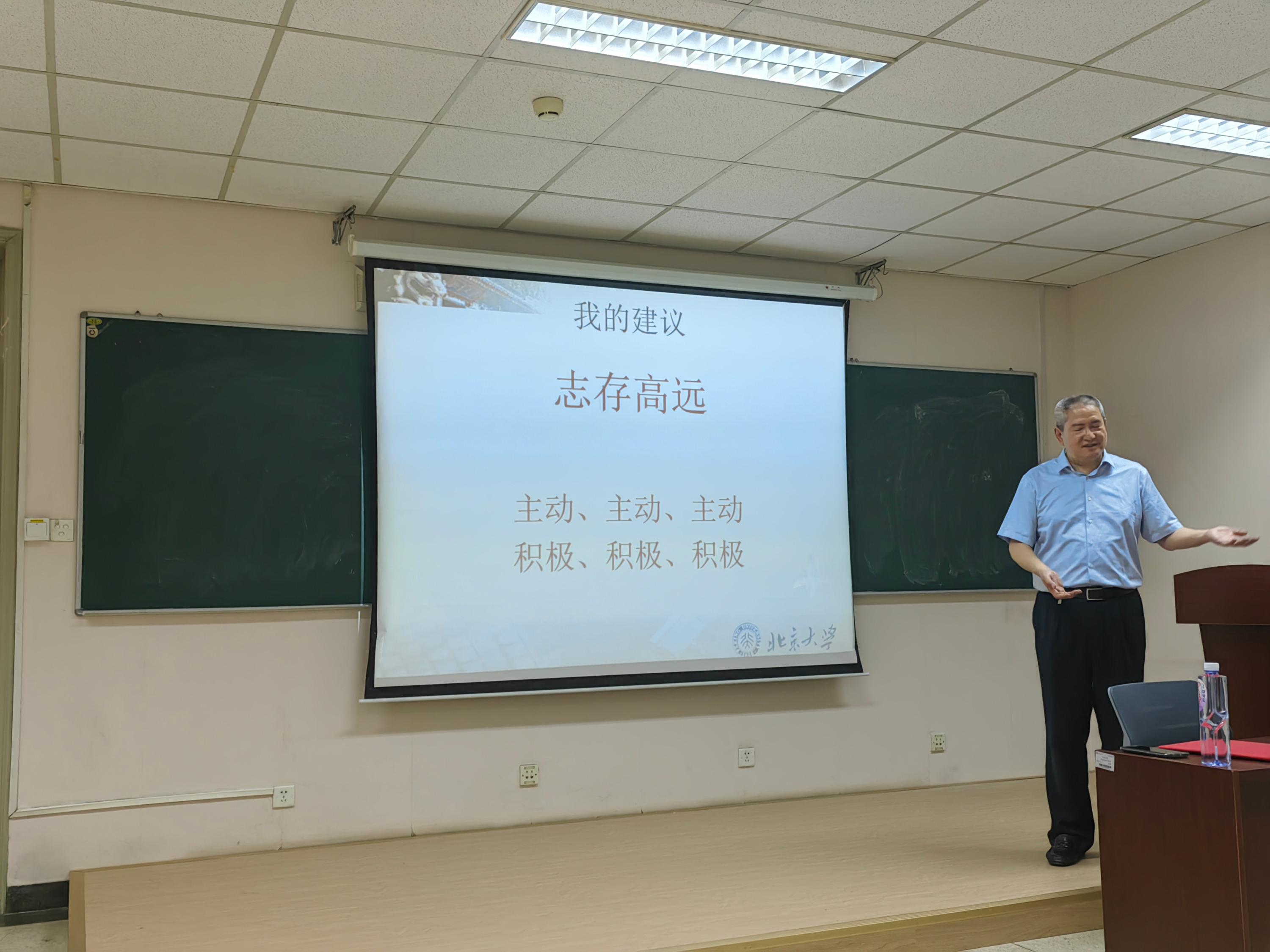 随后,谢冰老师以“志存高远”为题,串联起学习、生活、科研的各个环节,结合生动的案例,为同学们上了一堂别开生面的思政课。他首先回顾了大一刚入学时作的第一次报告,重申脚踏实地、仰望星空、志存高远、展翅高飞的“大学四部曲”。他指出,同刚入学时的懵懂相比,处在大二下半学期的学生不应该还是仅仅专注于学业本身,应该更多地思考未来的去向,思考身为一个北大人应该具有的格局和担当。多问自己:北大学生应该是什么样的人?作为燕园学子,眼光仅仅囿于毕业后的一份所谓好工作是远远不够的,更应树立远大理想,立志服务于国家重大发展战略,不断提升能力素养,争做新时代中国优秀青年的“领头雁”。