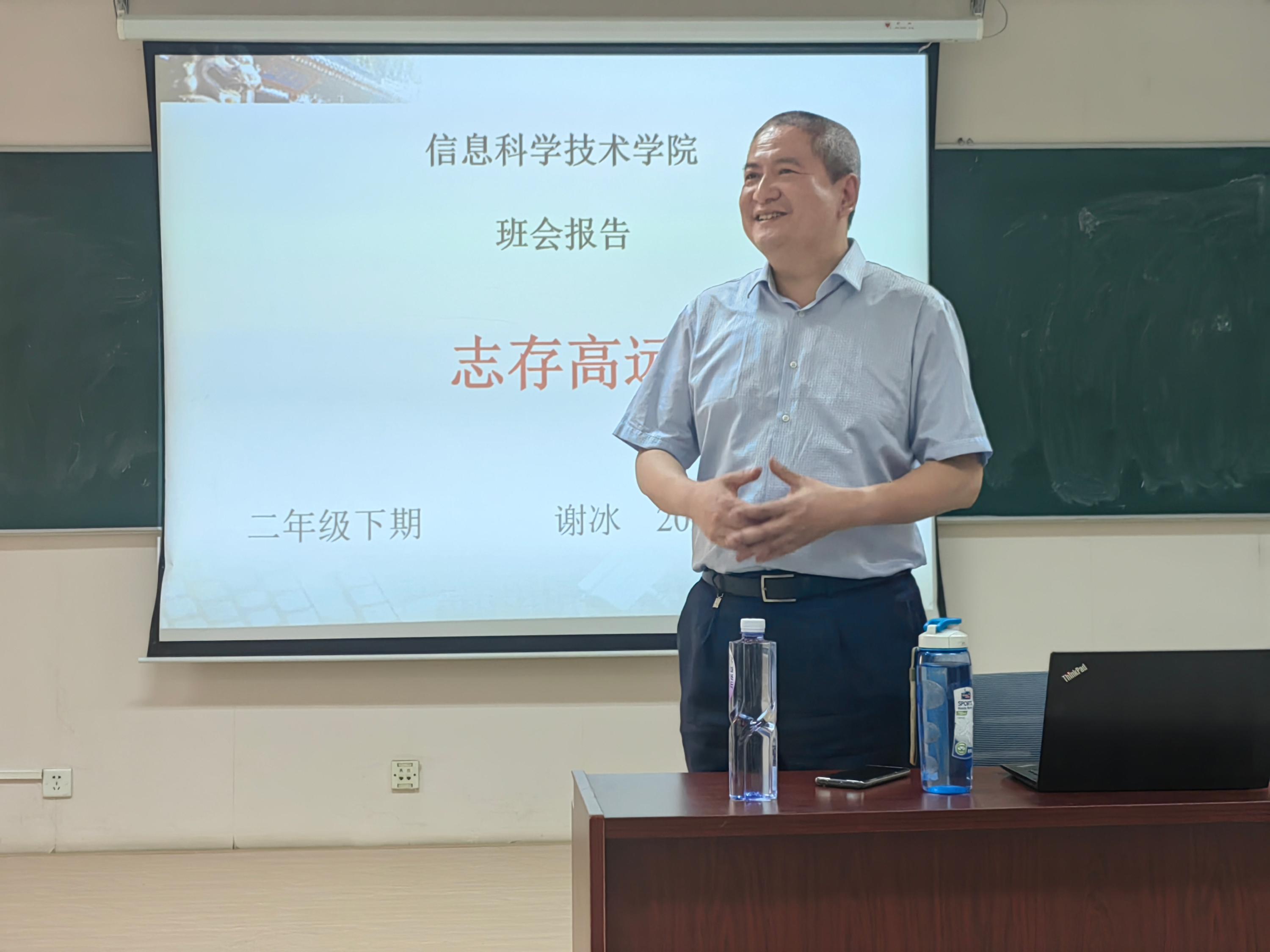 习近平总书记在主持中共中央政治局就加强基础研究进行的第三次集体学习时强调,加强基础研究,是实现高水平科技自立自强的迫切要求,是建设世界科技强国的必由之路。2024年,北京大学围绕“学科质量年”主题,面向2030学科建设目标,不断巩固基础学科“四梁八柱”,深化交叉融合。2023年,信息科学技术学院2022级8班过关斩将,脱颖而出,荣获“2022-2023学年北京大学示范班集体”荣誉称号。进入第二年,班级同学有迁出和迁入,又形成了一个新集体。2022级的学生正身处大二下半学期的关键节点,面临着选择方向,申请进组,开始科研和未来规划等一系列探索和选择。5月12日下午,信息科学技术学院2022级8班邀请北京大学科学研究部部长、班级第二班主任谢冰教授为同学们开展主题班会,从志存高远、自我定位、科研路径和生涯发展等方面同班级同学们进行了深入的交流,传道授业,启智润心。学院学生工作办公室主任、2022级年级辅导员李子奇,2022级8班班主任余肇飞、辅导员秦昊参加了活动。