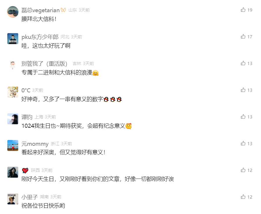 值得一提的是,学院在10月24日程序员节当天,联合北大官微策划发布《输入生日,北大为你生成专属代码!》专题推送,设计了将生日与二进制巧妙结合的小游戏,以简洁而严谨的语言,面向校内师生与校外广大群众科普有关信息科学的基础的知识,受到社会各界广泛关注,阅读量快速超过10万!许多热心网友纷纷留言,表达对信息学科的关注和对北大信科的仰慕。