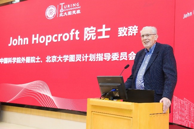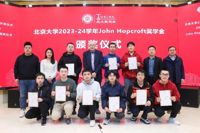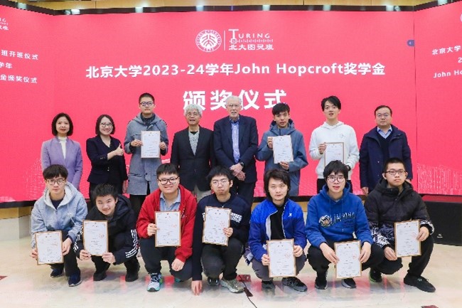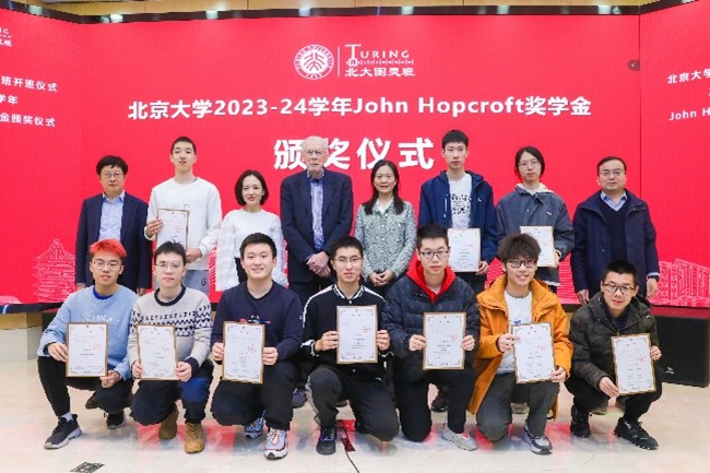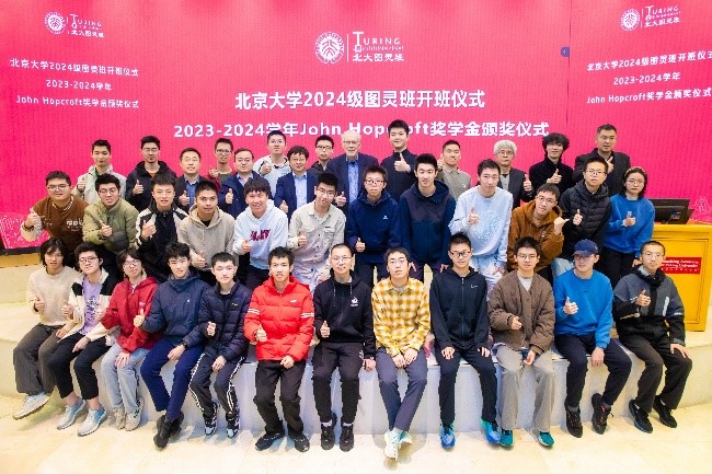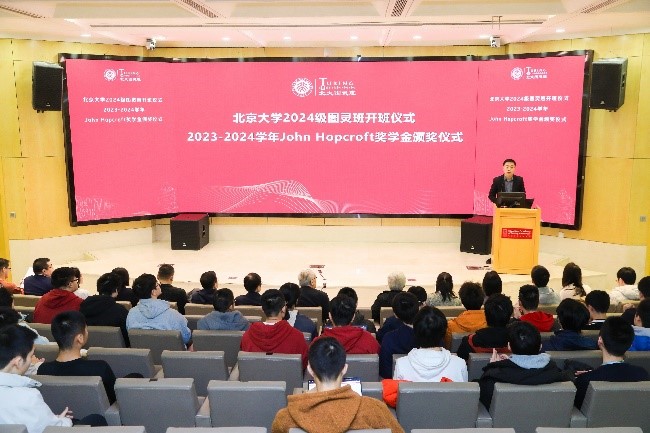 2024年11月21日,北京大学成功举行2024级图灵班开班仪式暨第五届John Hopcroft奖学金颁奖仪式。中国科学院外籍院士、北京大学客座讲席教授John Hopcroft,中国工程院院士、北京大学信息与工程科学部主任高文,计算机学院院长胡振江、副院长郭耀,前沿计算研究中心执行主任邓小铁,图灵班班主任代表刘云淮,以及字节跳动、真格基金、商汤科技、微软亚洲研究院、快手、九坤等捐赠企业代表和图灵班学生共同出席仪式。活动由信息科学技术学院党委副书记贾方健主持。