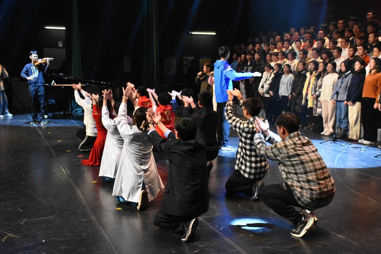 灯光暗场,小狮子们和学院党委书记严敏杰、院长侯士敏、副院长邓斌、党委副书记贾方健一同站上舞台。尽管在排练中已经无数次听过那熟悉的开场伴奏,但当《最美的相约》的旋律在钢琴与小提琴的协奏中缓缓响起时,每个人的内心仍然无法抑制地澎湃起来。在这一刻,所有的紧张和焦虑都化为力量,小狮子们准备以最佳的状态,展现他们最精彩的表演。舞台组的同学们扮演了社会上的多种角色,每个身份都彰显了他们对社会的深切关怀和对责任的承担,这些年轻的社会工作者用他们的行动和热情,为抗击疫情贡献了自己的力量,同时也为青春的画卷增添了浓墨重彩的一笔。他们的故事,如同一首激昂的进行曲,激励着我们每一个人。小狮子们唱出了青春的坚韧和不屈,唱出了在逆境中成长的力量。每一次的援助,每一次的奉献,都是对未来的坚定承诺,都是对青春价值的最好诠释。