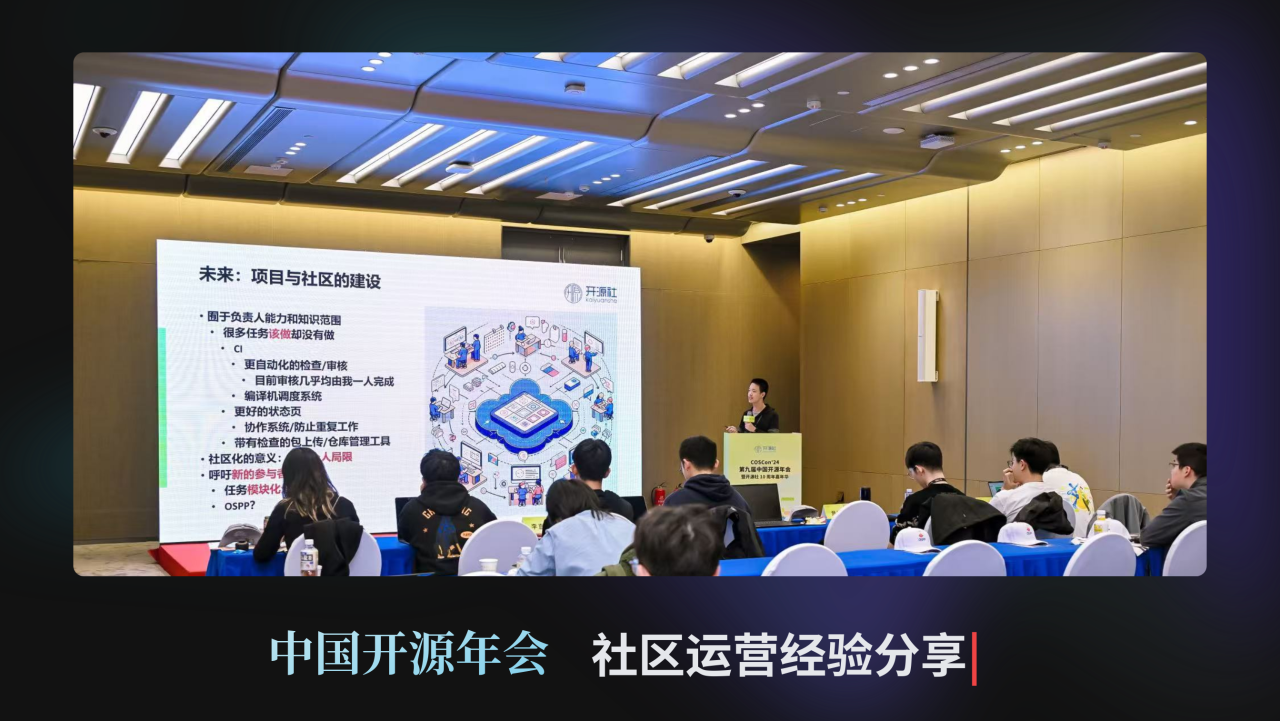 社团秉持开放共享理念,积极参与社区活动,将研发成果无私回馈上游社区,在全球开源舞台上展现中国学子的风采与担当。周乾康同学在中国开源年会上分享了有关龙芯软件生态的社区建设与运营经验,获得广泛认可。这不仅向外界传递出社团在科技探索道路上积极进取的态度,也激励同学们将个人成长与国家发展紧密相连。