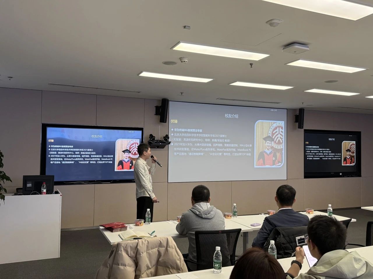 参观结束后,同学们移步至会议室与华为北京研究所工作人员座谈交流。华为北研所招聘经理王松、陈阳和北京大学校友、华为北研所职员陈牧歌、伏臻参与交流。