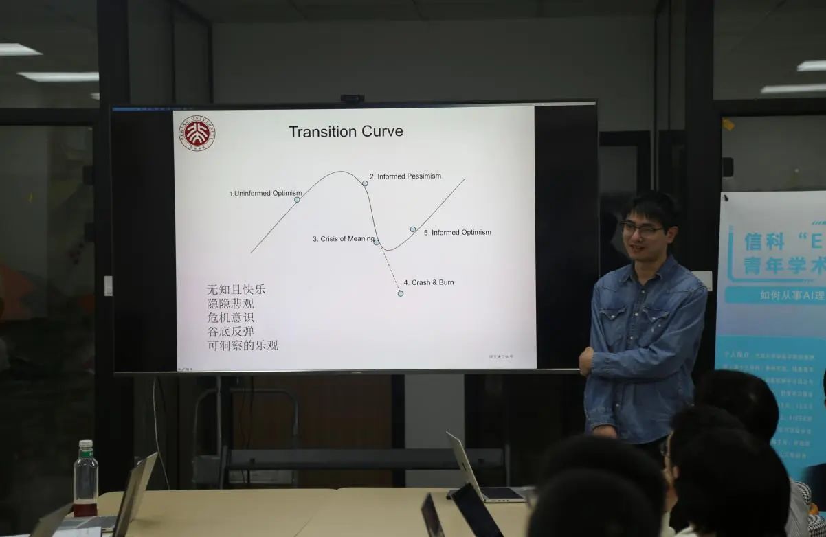 紧接着,方聪老师向同学们强调了AI理论研究需要的四大要素。首先最重要的就是自身的兴趣,他强调投身AI理论研究必须要具备对理论的浓厚兴趣、自发地想去做AI理论方面的议题。其次是时间,要有愿意锻炼自学与自我钻研能力。然后是一定的抗压能力,以及适当的导师指导,要积极与导师沟通,摸清问题的方向所在。接着方聪老师通过“科研曲线”形象地向同学们介绍了科研过程的五个阶段:无知且快乐、隐隐悲观、危机伊始、谷底反弹以及可洞察的乐观。