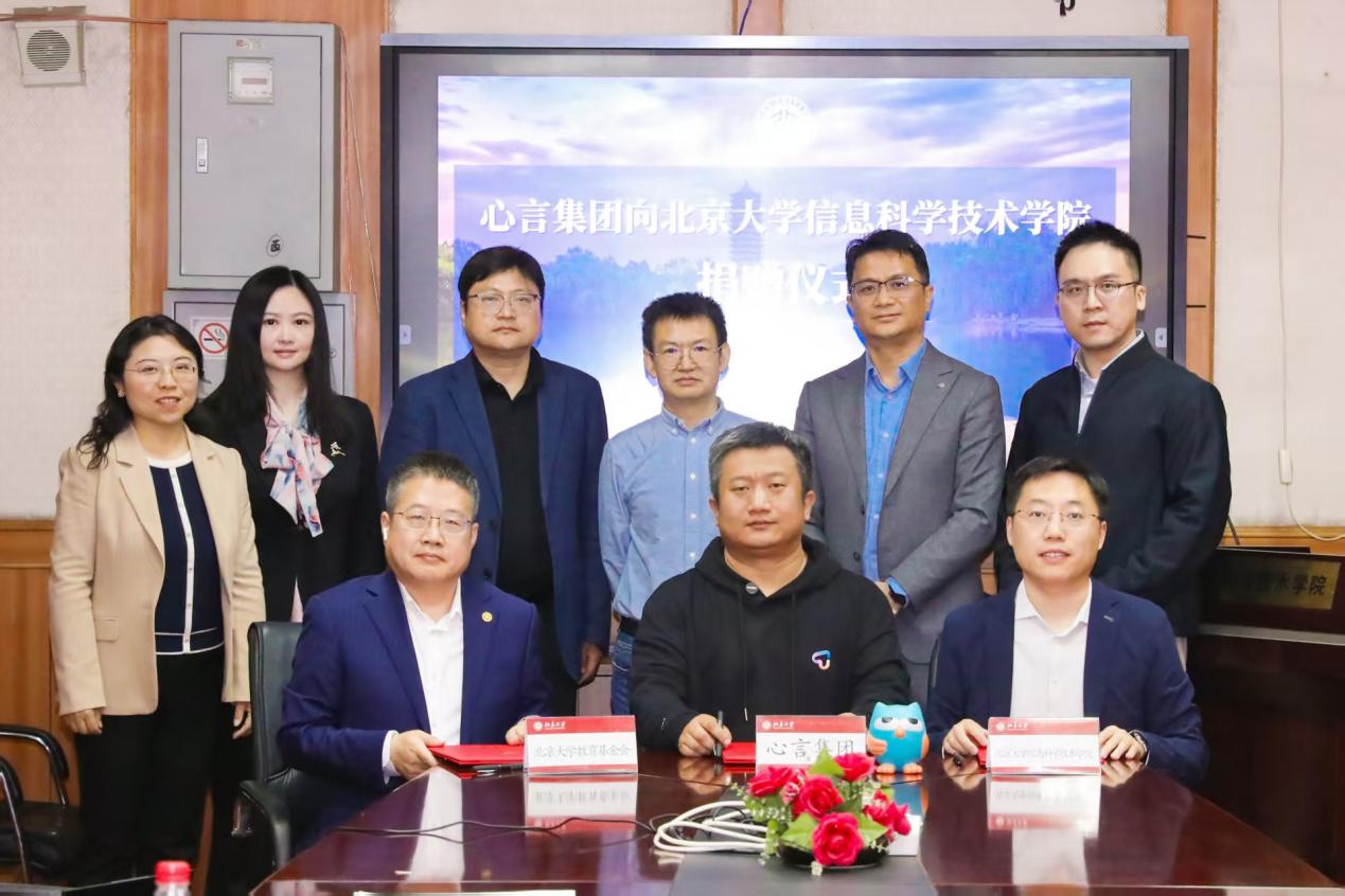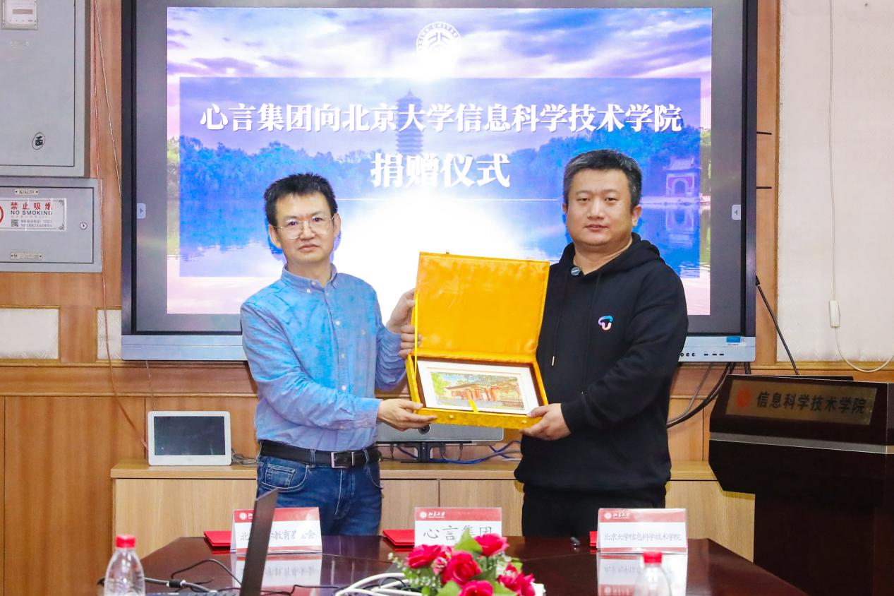 任永亮、王勇、贾方健分别代表捐赠企业、北大教育基金会和信科学院共同签署捐赠协议。签约仪式后,王勇代表学校向心言集团颁发感谢状,侯士敏代表学院向心言集团赠送纪念品。