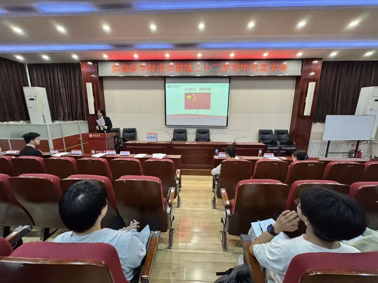 2025年9月28日上午,信息科学技术学院第二十三次学生代表大会在理科二号楼2129报告厅顺利召开。来自学院四个年级的30名学生代表出席会议,听取并审议了第二十二届学生会执委会工作报告,选举产生了新一届的学生会执委会主席团。