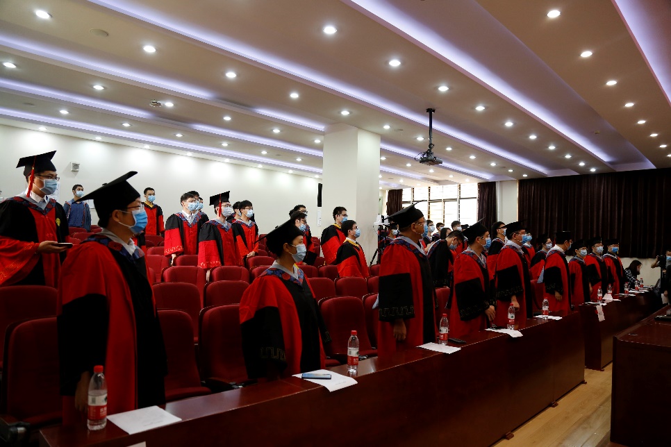 毕业典礼首先播放了毕业生回忆视频。视频记录了本届毕业生在校期间的点点滴滴。从“一二九”的歌声到军训时的汗水,从学习生活的紧张充实到“一起运动”等文体活动的欢声笑语,每一位同学都跟随视频回顾了自己美好的大学时光。感动过后,全体人员线上线下齐唱国歌。