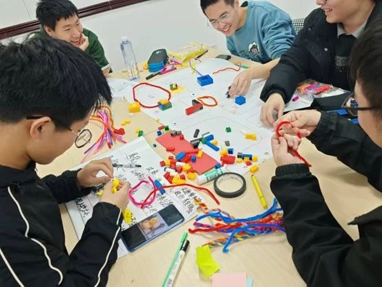 成员们利用现场的物料,将头脑风暴中形成的点子,一个个拼接融合起来,将想法具象化。又通过互相体验,不断优化和改进各组的设计。不同小组之间的交流合作也激发了全新的创意,让解决方案更加的多元化与普适化。