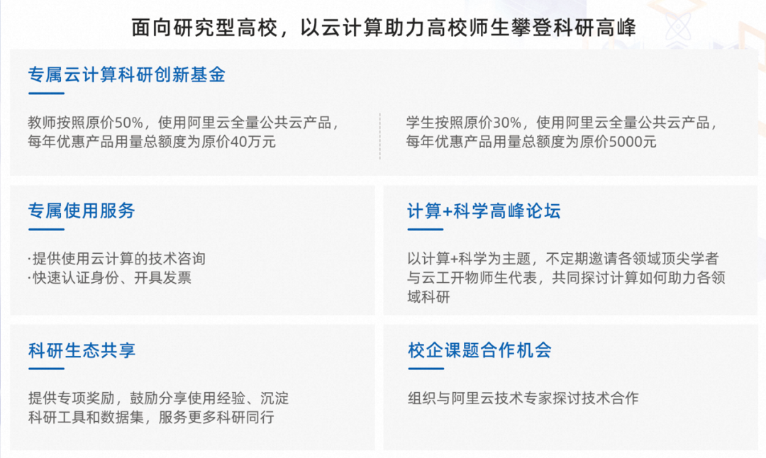 云工开物是阿里云支持高校学生开展云上创新的合作项目。项目为每位大学生提供一台免费云服务器、专属云计算科研创新基金,以及配套的实践课程,以云计算助力高校师生攀登科研高峰,取得有世界影响力的学术成果。